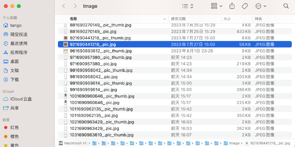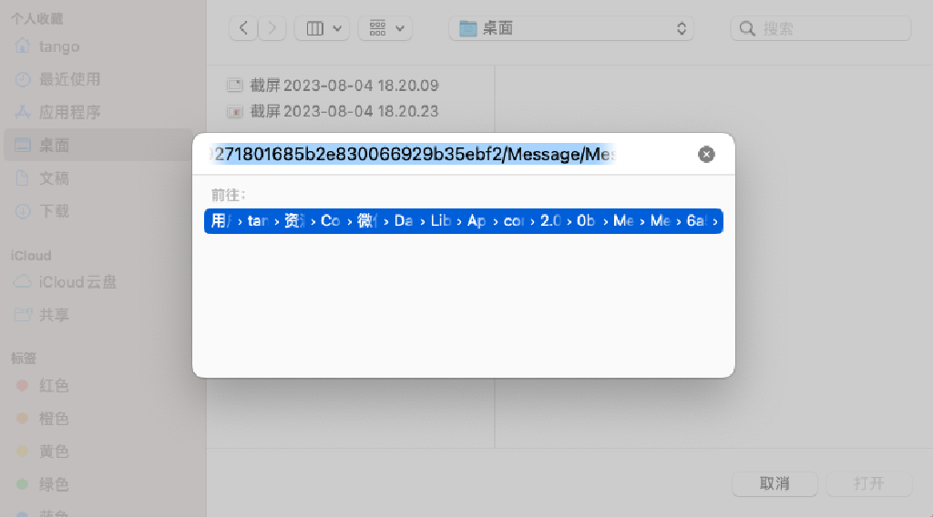 路径示例:/Users/xxx/Library/Containers/com.tencent.xinWeChat/Data/Library/Application Support/com.tencent.xinWeChat/2.xxx.9/0bxxx/Message/MessageTemp/9exxx/Image/92xxx_.pic.jpg